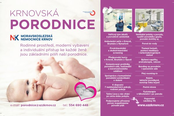 Oznámení pro budoucí maminky: ve dnech 27.4. a 18.5.2026 v 15.00 hod se koná prohlídka krnovské porodnice. Sraz je v přízemí gynekologické ambulance, budova B. Během prohlídky se budoucí rodiče seznámí s prostředím porodnice, s oddělením šestinedělí, novorozeneckým úsekem a personálem. Seznámí se s typy alternativních porodů / porod do vody, na vaku, porodní stoličce apod./ bondingem a následnou péčí o novorozence a jeho maminku na oddělení…