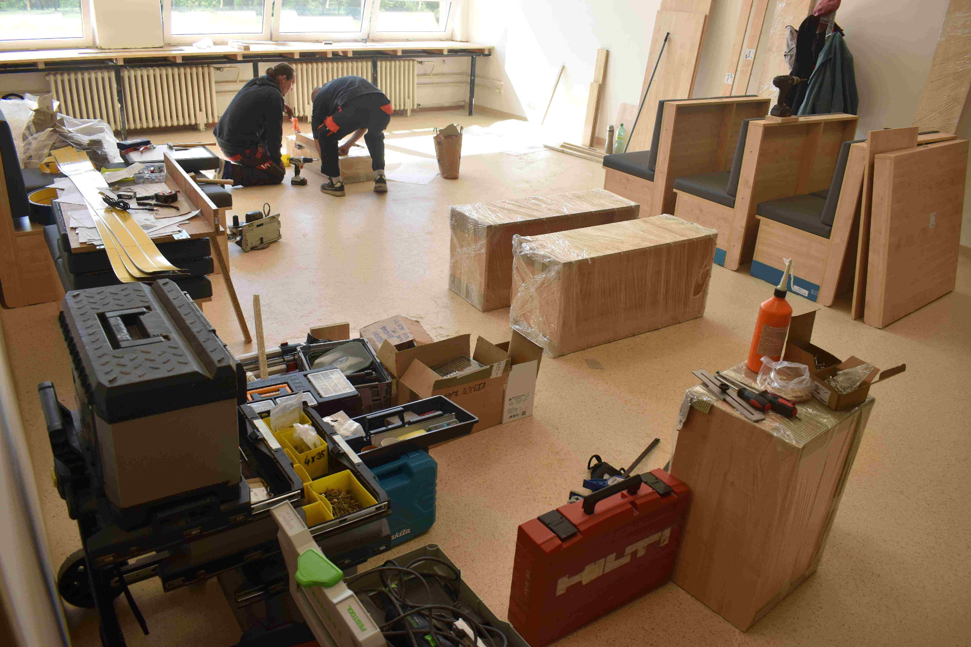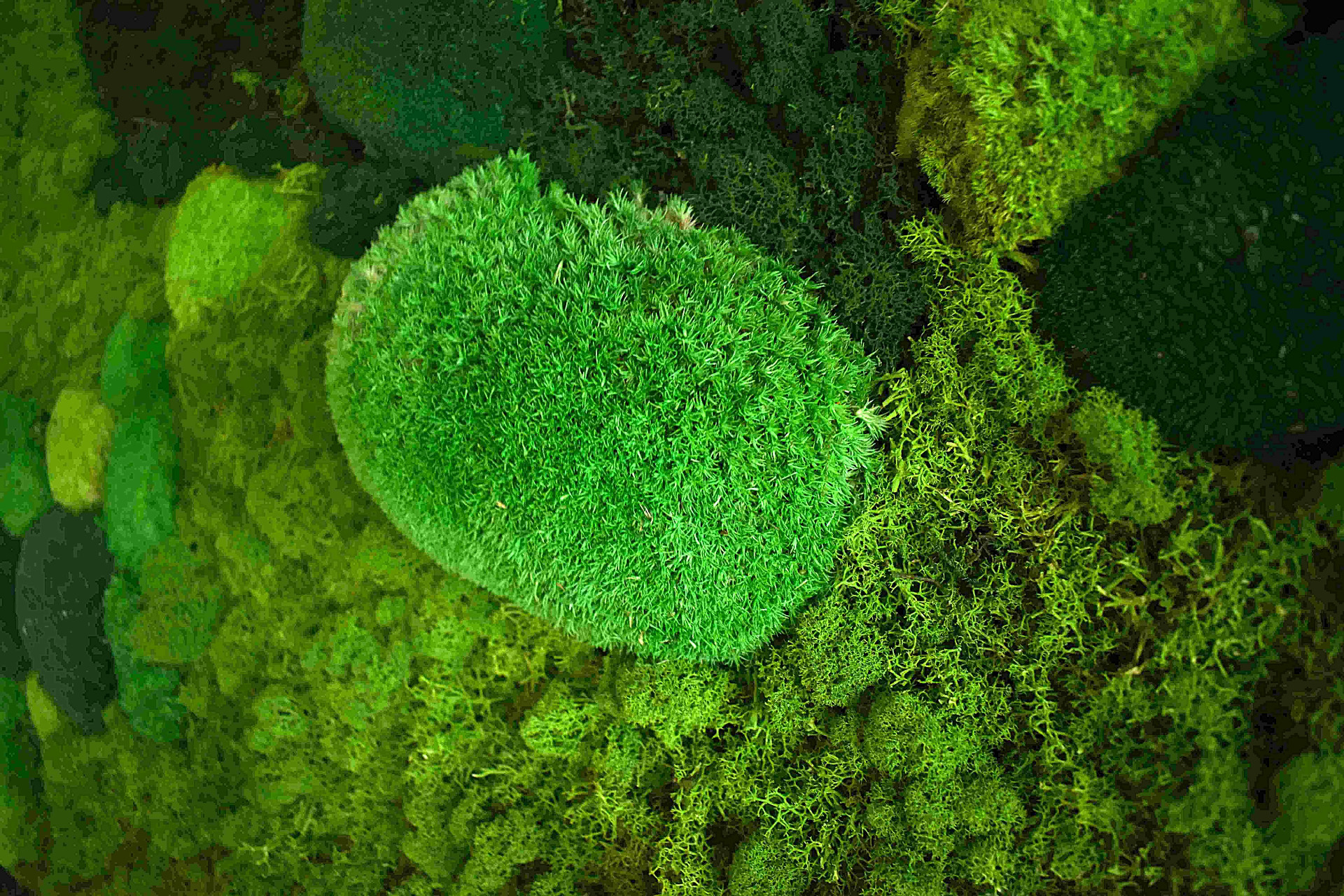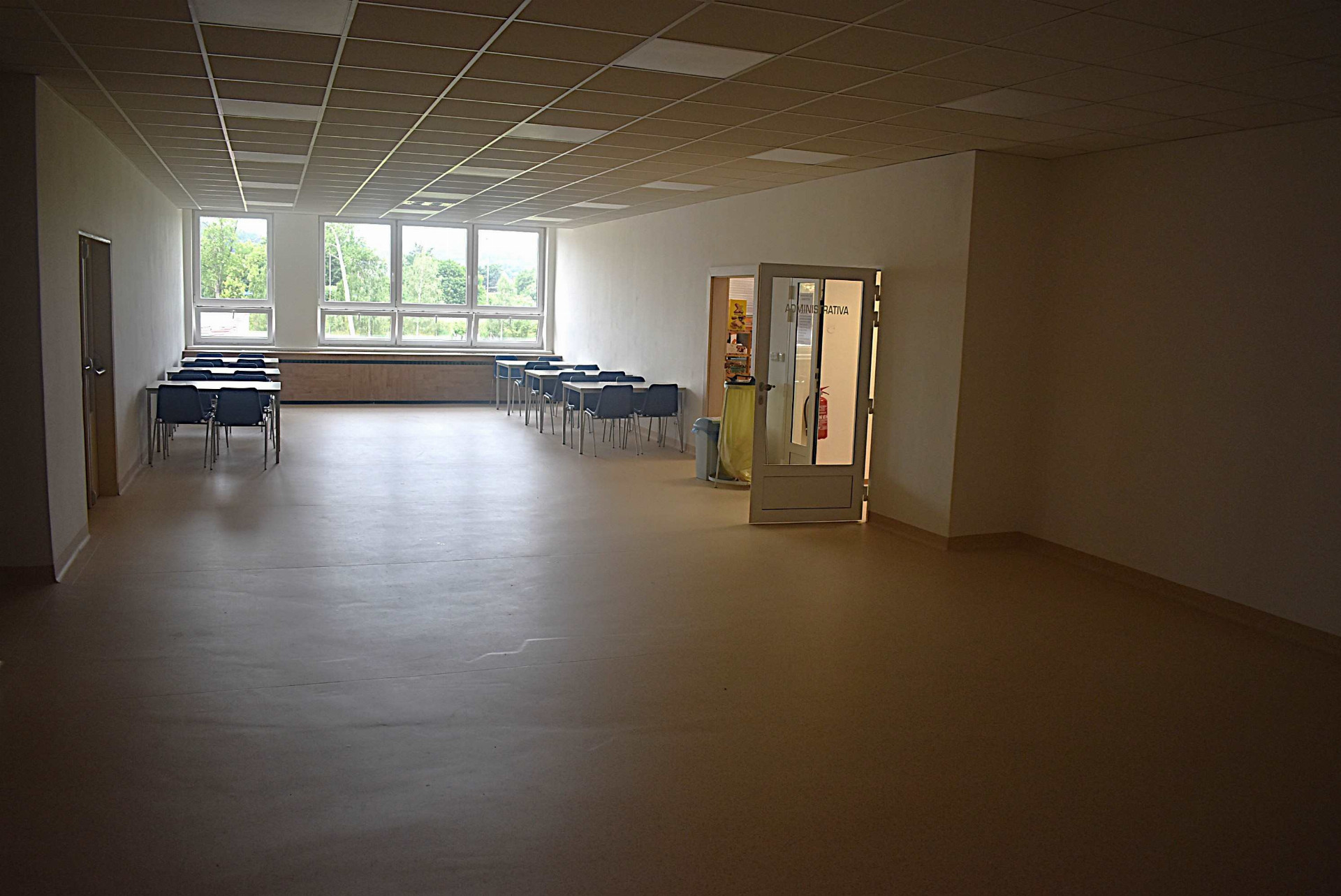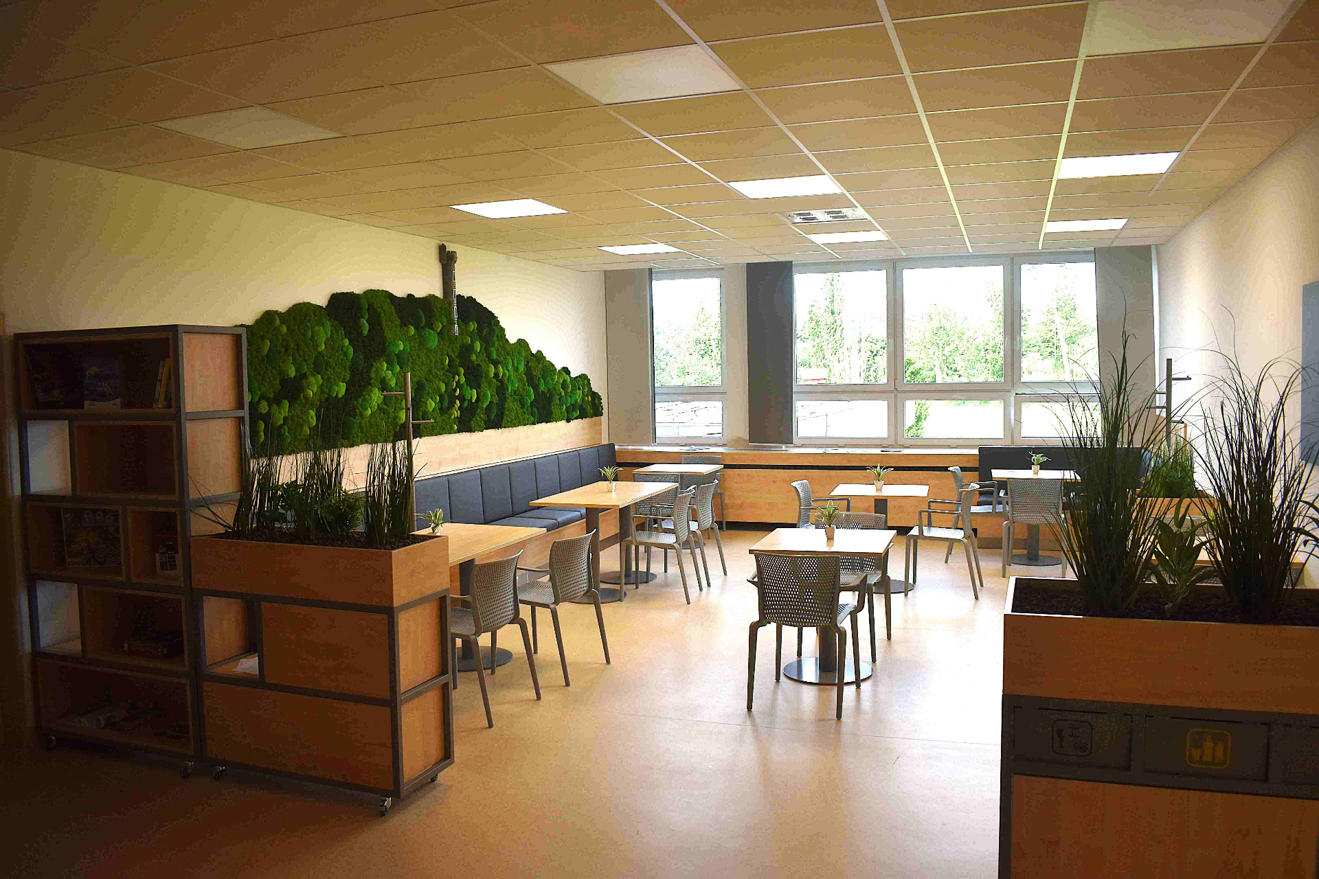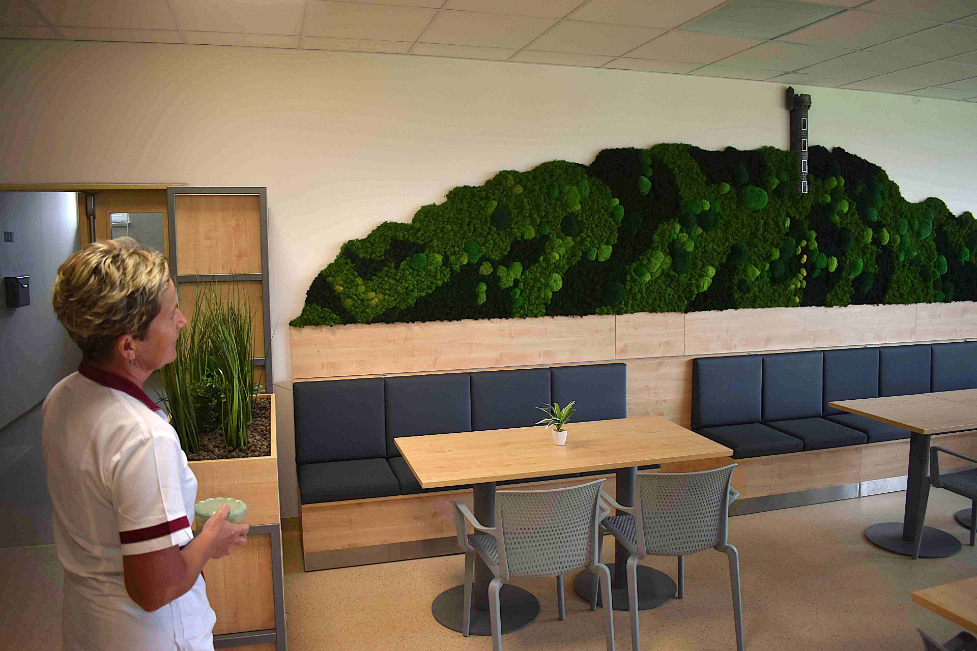 Projektantka Pavla Stebelaková si nejvíce lámala hlavu s tím, jak zaplnit velkou bílou stěnu bufetu. „Vzhledem k tomu, že se prostor jídelny pravidelně dezinfikuje ionizátorem vzduchu, nelze zde bohužel umístit živé rostliny. Proto jsem nemohla použít živou květinovou stěnu a jedinou možností tedy zůstala plochá fotografie nebo plastická imitace lesního porostu pomocí stabilizovaného mechu. Stabilizovaný mech je skutečný přírodní mech, který prošel speciálním procesem konzervace. Byl zbaven vody a napuštěn zdravotně nezávadným stabilizačním roztokem z glycerinu. Výhodou je, že takto upravený mech nebo lišejník nepotřebuje denní světlo, zálivku a nepoškodí jej ani ionizátor,“ vysvětlila Pavla Stebelaková. Mech navíc nepotřebuje žádnou větší údržbu, jen jednou za několik měsíců se z něj musí opatrně odstranit prach.