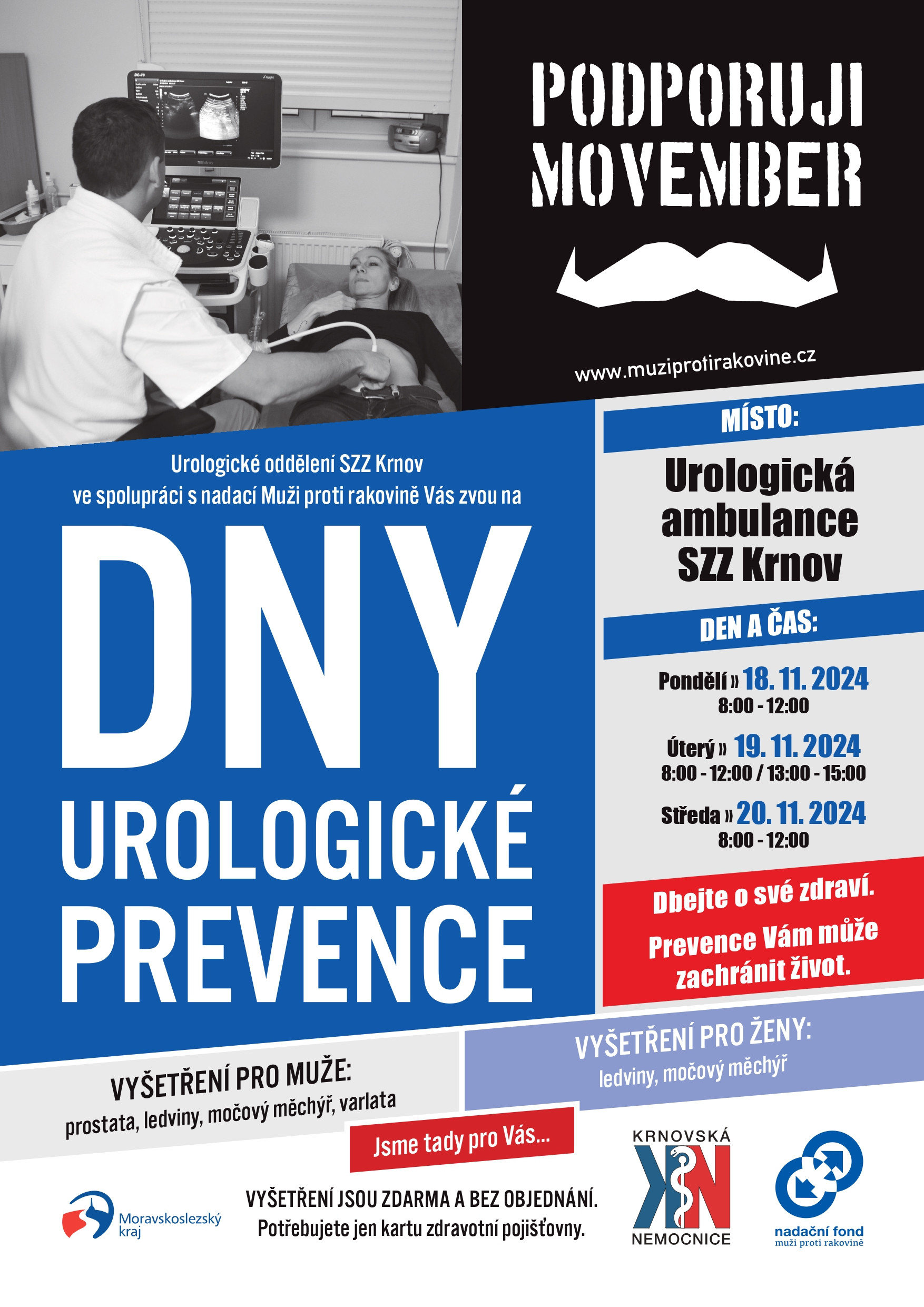 Vzhledem k tomu, že listopad provází osvětová akce „Movember“, je prevence v těchto dnech zaměřena také na mužské pohlavní orgány. U mužů jde především o prostatu a varlata, dále pak se zaměřuje na ledviny a močový měchýř. U žen se Dny urologické prevence týkají zdraví močového ústrojí. Tato osvětová akce probíhá díky spolupráci Krnovské nemocnice s nadačním fondem Muži proti rakovině.