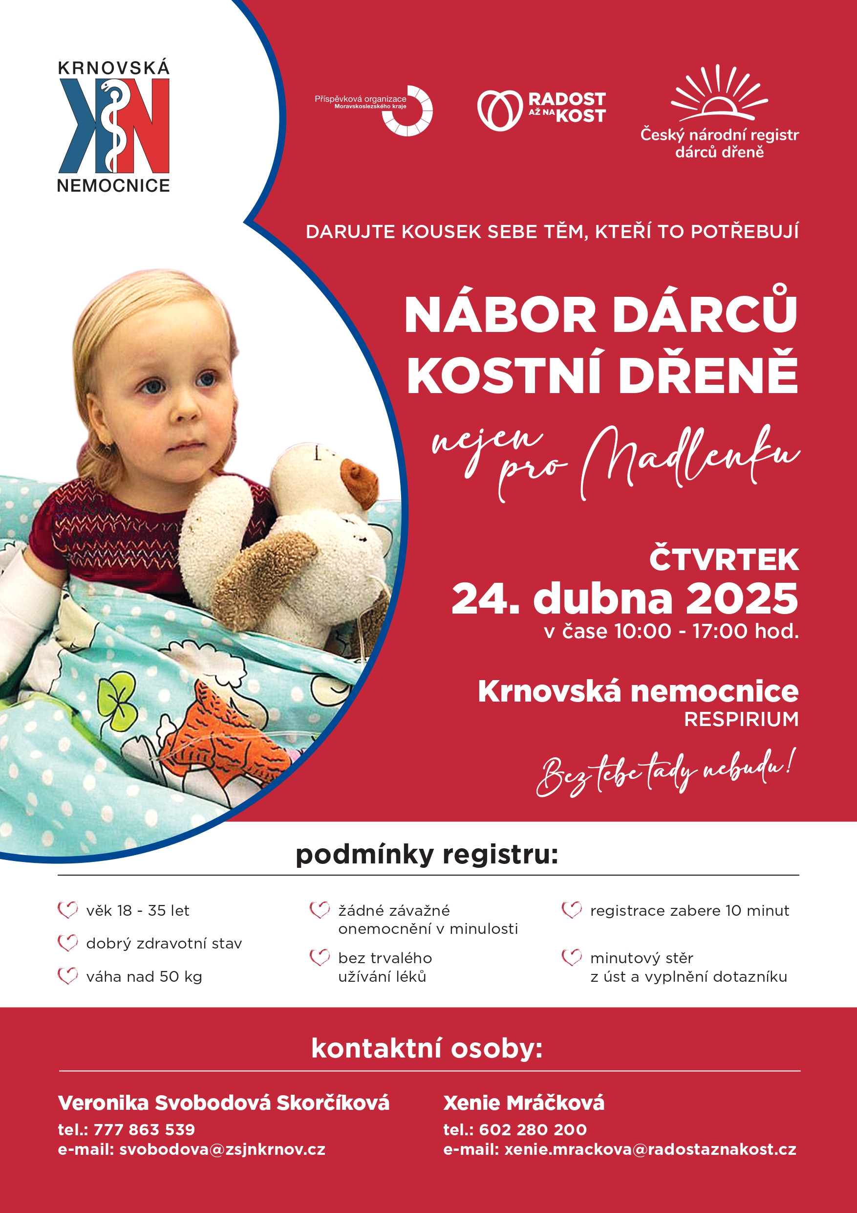 Krnovská nemocnice 24. dubna 2025 pořádá celodenní akci „Nejen pro Madlenku“. Zdravotníci ve spolupráci s dobrovolníky podpoří Český národní registr dárců dřeně. Nabídneme zájemcům možnost zápisu do registru potenciálních dárců. Představíme skutečné dárce a příjemce kostní dřeně z Krnova. Na základě své osobní zkušenosti jsou připraveni prezentovat spoluobčanům jak funguje dárcovství a transplantace. Podpoří rozšiřování registru, který dokáže propojit příjemce a dárce kostní dřeně.