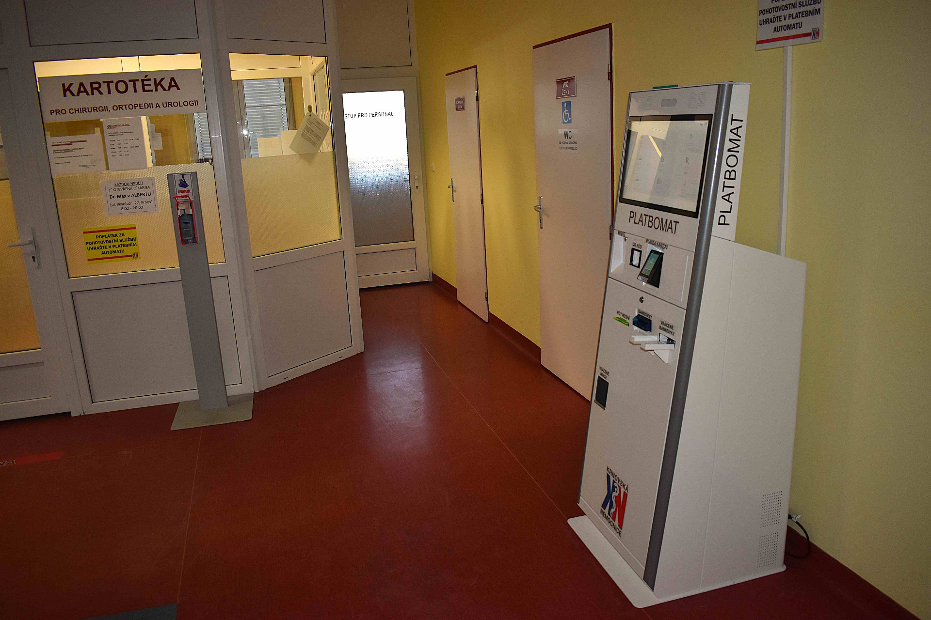 Krnovská nemocnice zavedla novinku v podobě platbomatu. Přístroj instalovaný v čekárně centrálního příjmu akceptuje platby v hotovosti i kartou. Platbomat poslouží pacientům, kteří se kvůli zhoršení zdravotního stavu rozhodli vyhledat ošetření na pohotovosti mimo obvyklou pracovní dobu ambulancí. Kromě devadesátikorunového regulačního poplatku za Lékařské pohotovostní služby (LPS), který je stanoven zákonem, nabízí platbomat vyřízení také dalších poplatků.