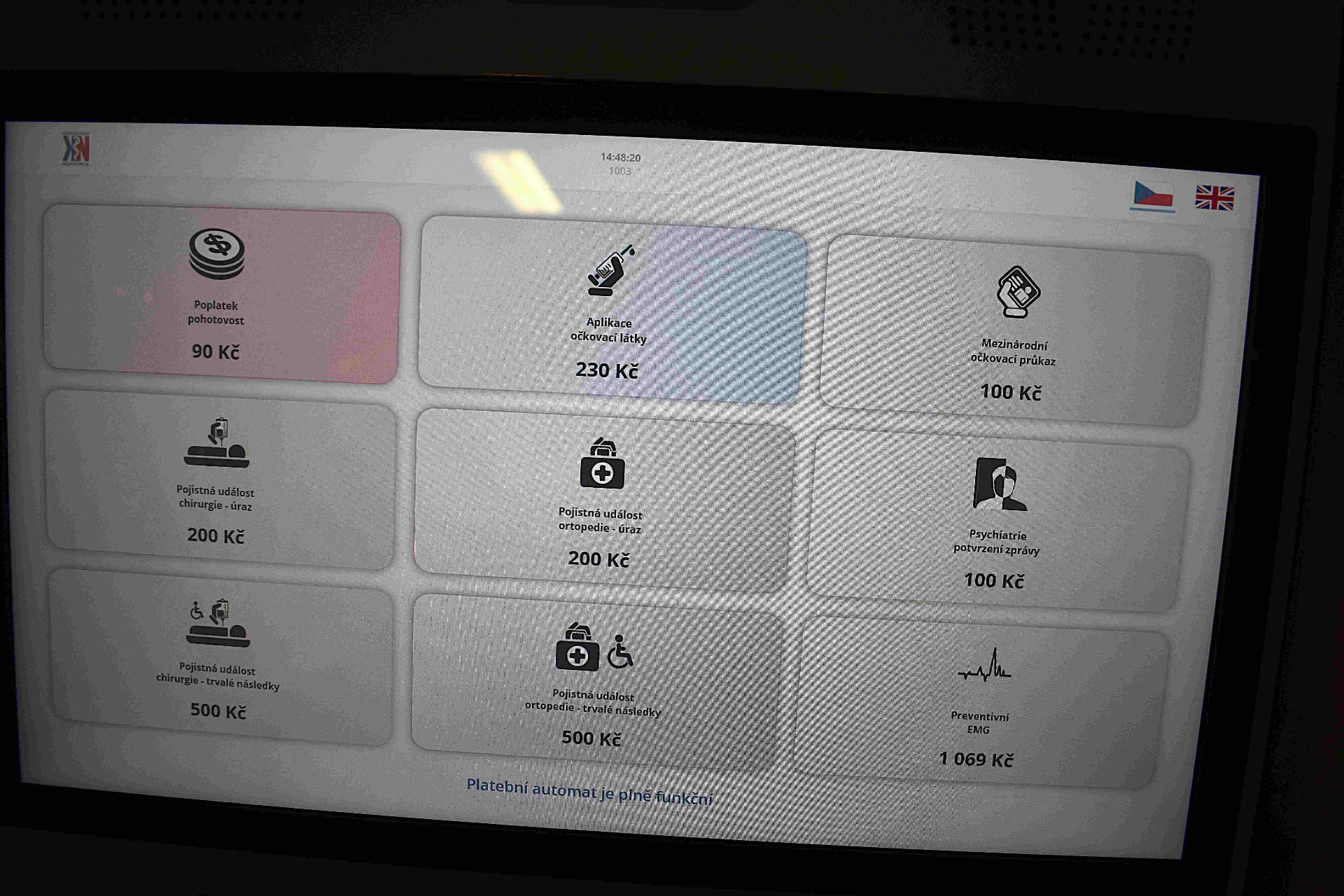 Pomocí platbomatu lze samozřejmě hradit také další správní poplatky, jako vyřízení Mezinárodního očkovacího průkazu, aplikaci očkovací látky, preventivní EMG vyšetření, nebo další zpoplatněné výkony. Díky platbomatu vyřídí pacient všechno sám i mimo úřední hodiny nemocniční pokladny.