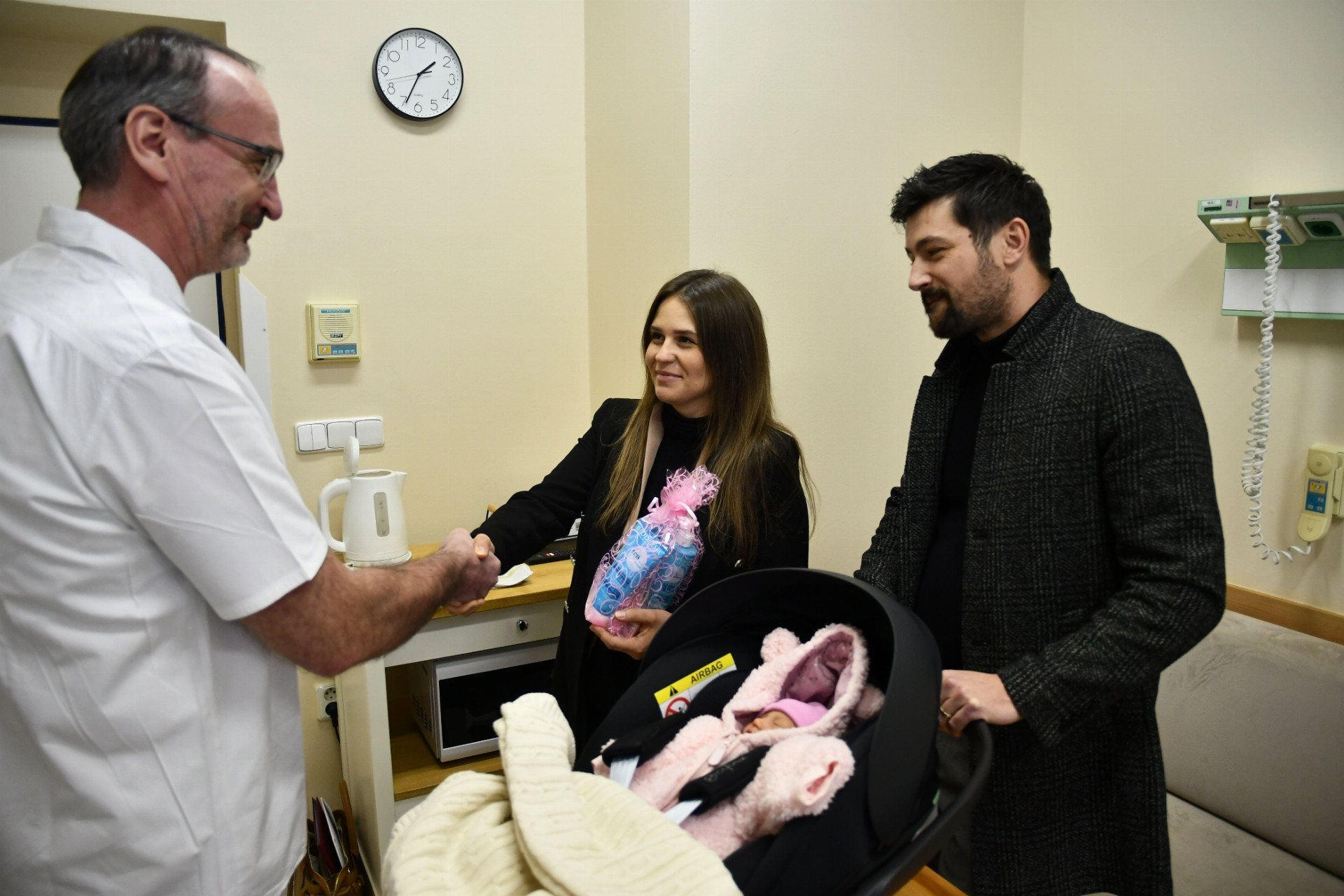 Dáreček od nemocnice pro první miminko roku 2025 rodičům předala náměstkyně pro léčebnou péči SZZ Krnov MUDr. Marie Žaloudíková spolu s primářem gynekologicko-porodnického oddělení MUDr. Jozefem Pitoňákem, Ph.D. „Na první miminko jsme letos sice malinko čekali, ale už se nám oddělení plní maminkami,“ sdělil primář Pitoňák.