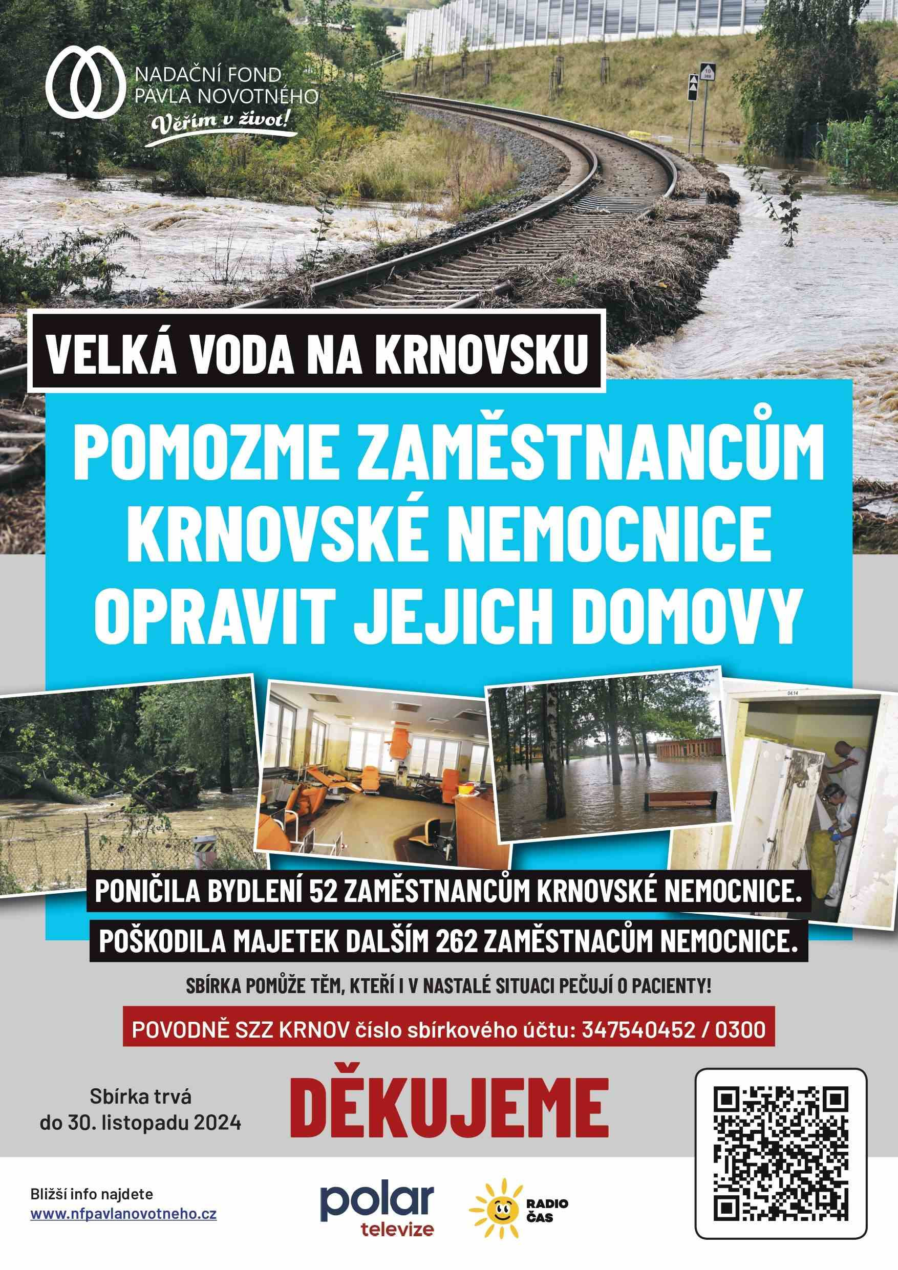 Ničivá povodeň, která se v září prohnala Krnovskem, připravila o bydlení 52 zaměstnanců nemocnice v Krnově. Dalších 262 zaměstnanců má poškozen majetek. Na základě této informace vyhlásil Nadační fond Pavla Novotného sbírku s cílem pomoci opravit domovy zaměstnancům nemocnice. Poslední možnost přispět do sbírky bude v sobotu 30. listopadu 2024.