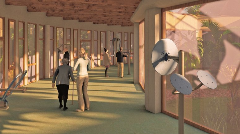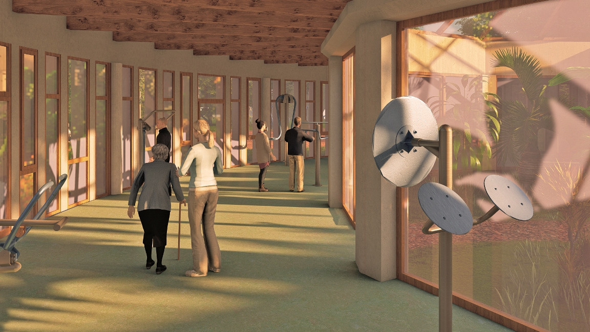 FOTO vizualizace rehabilitace 1, 2, 3, 4 – Krnovská rehabilitace patří mezi špičková pracoviště v rámci Moravskoslezského kraje. Nejpozději za deset měsíců se dočká oddělení přístavby i moderního respiria.    Vizualizace: architekt Martin Janda