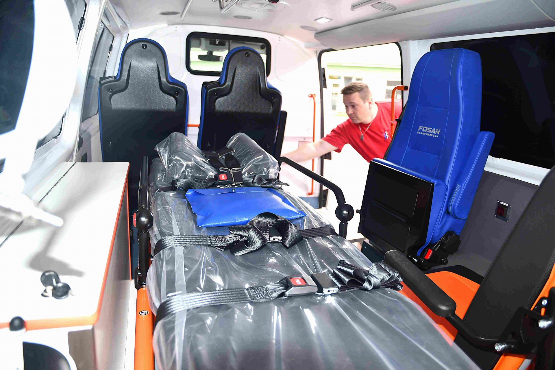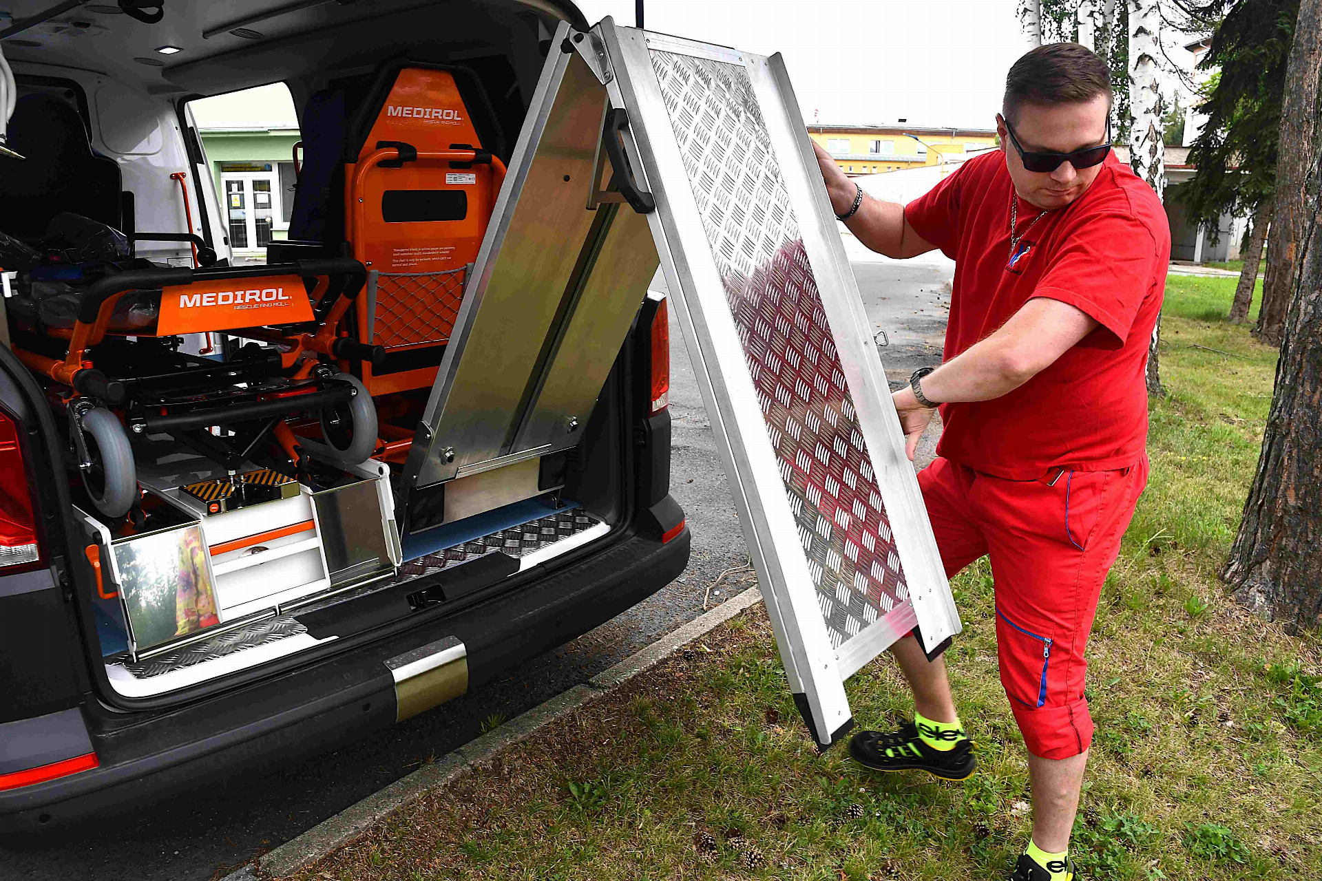 Pro imobilní pacienty a pro ty se sníženou schopností pohybu je ve výbavě sanitek převozové křeslo a polohovatelné transportní lůžko, obě s certifikovanou nosností 250 kilogramů. K tomu samozřejmě patří odpovídající nájezdové rampy. K vybavení sanitky patří také kyslíková láhev. „Vzhledem k tomu, že jsme letos získali dva nové oxygenátory, vozíme kyslíkovou láhev jen jako zálohu, ale primárně jsou pacienti, kteří potřebují kyslík, převáženi na oxygenátorech. Posádky sanitek musí pravidelně absolvovat školení, takže mohou pracovat jak oxygenátorem, tak s kyslíkovou lahví,“ doplnila Hana Kolofíková s tím, že kromě převozu pacientů mohou sanitky sloužit také při akutním transportu krve nebo převozu biologického materiálu.