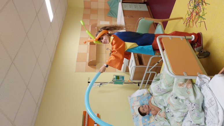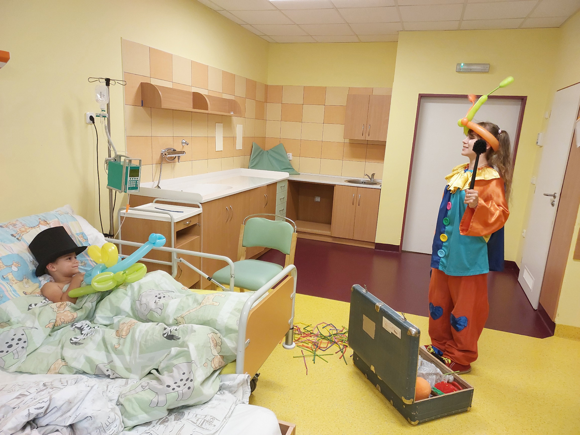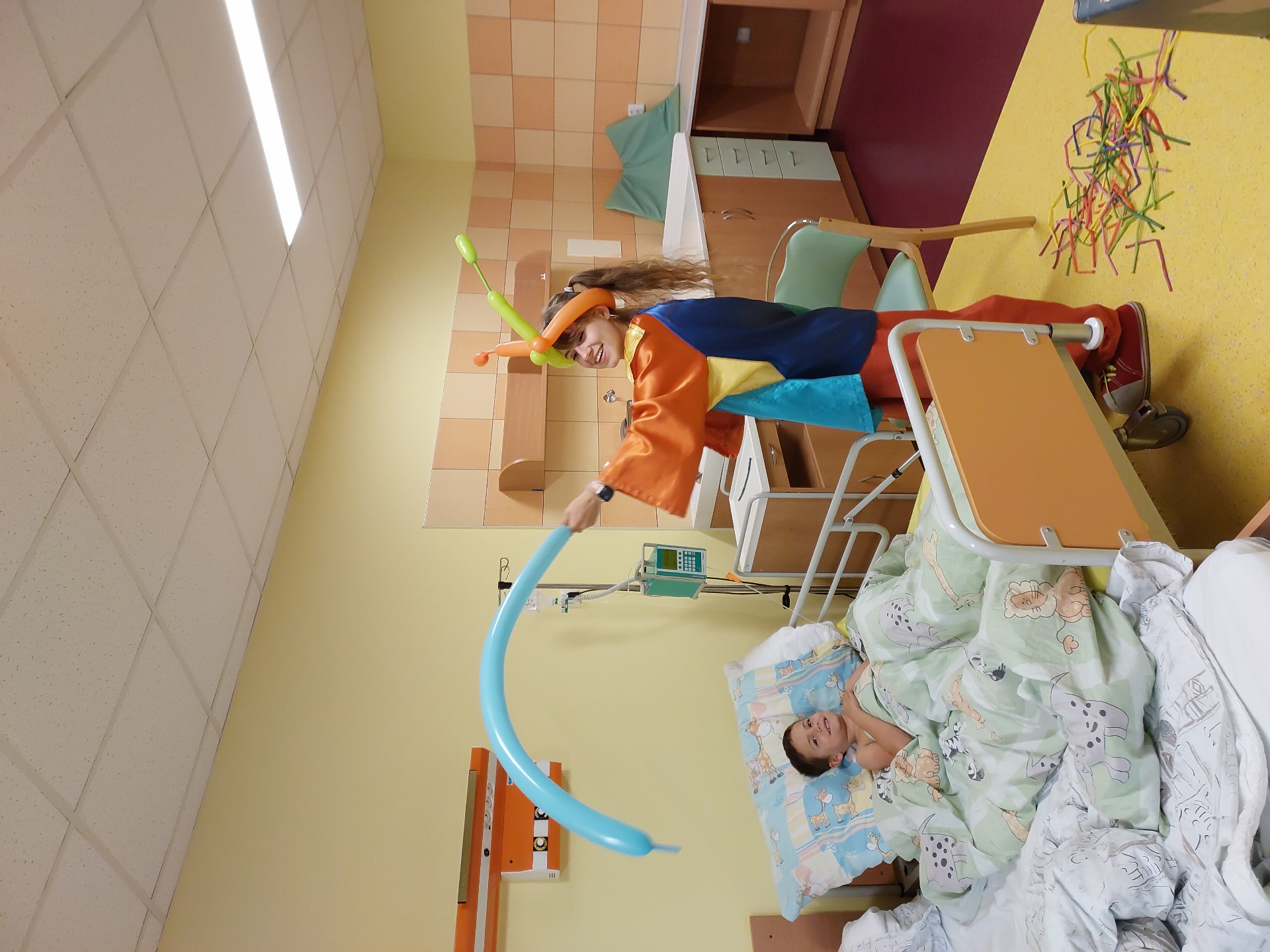 Úterý dopoledne své umění předvedla Adéla Valůšková, která si říká Klaunice Botička. „Představení jsou pokaždé jiná, menší děti potěší třeba zvířátko z balónku. Vyrábím pejsky, kočičky, teď v létě také včelky, palmy nebo i chobotnice. Starší děti se zabaví u hádanek nebo kouzelnických triků, proto mám s sebou kouzelný kufr. Cestujeme za dětmi tam, kde je nás potřeba. Největší odměnou je, když z nemocničního pokoje odcházím a vyprovází mě úsměv na tváři malých pacientů“ uzavřela Klaunice Botička.