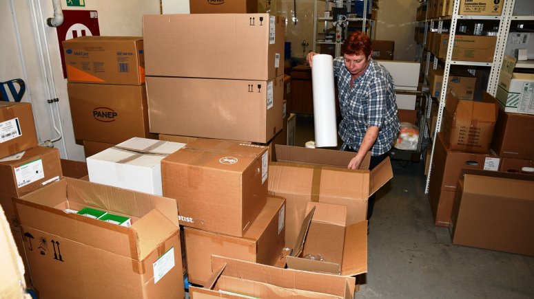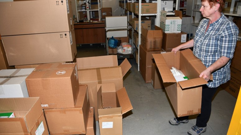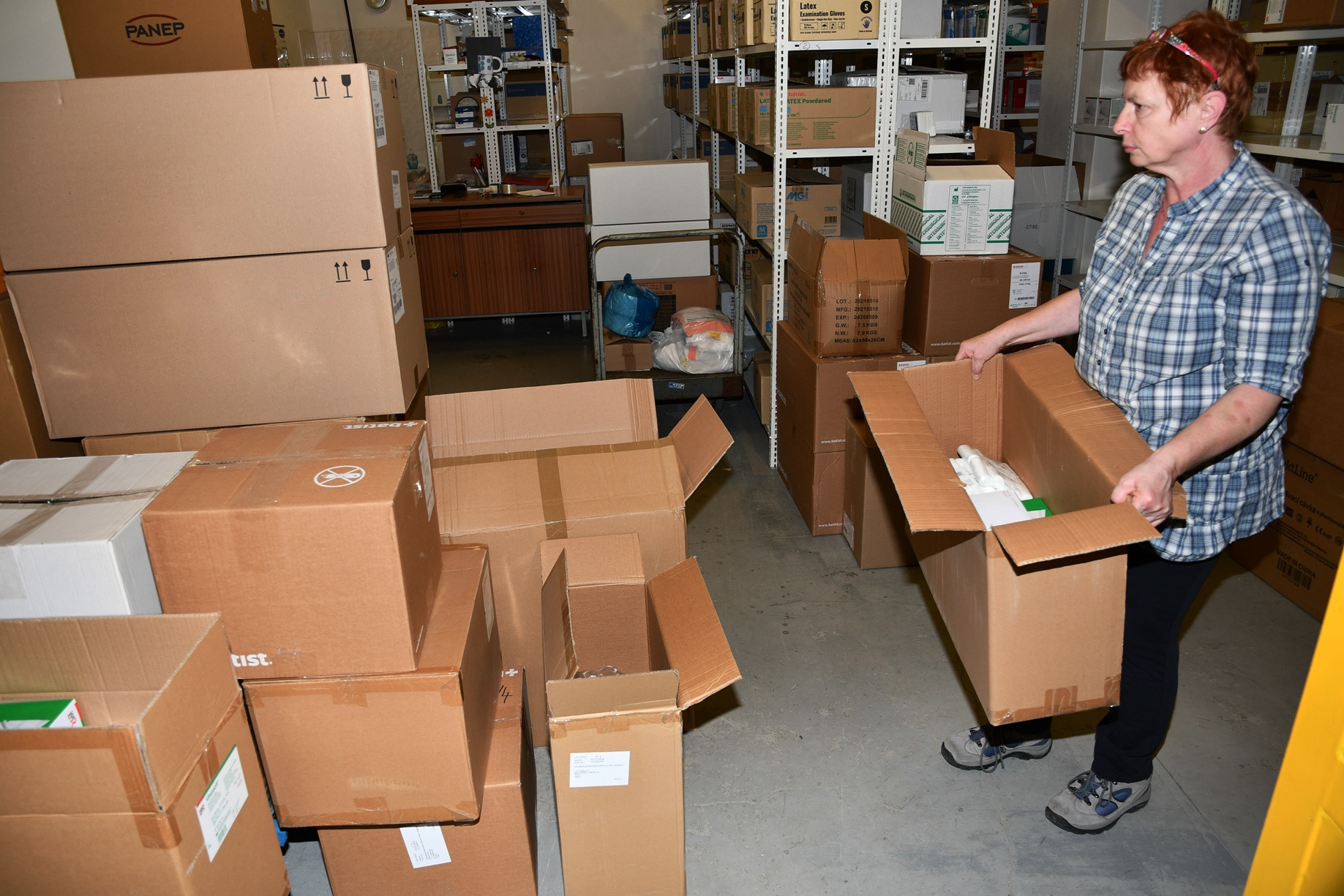 FOTO – sklad 1, 2 – Lenka Vágnerová z krnovské nemocnice vyrazila v sobotu do práce, aby dle pokynů ředitele Václavce připravila zdravotnický materiál pro ukrajinskou Nadvirnu. FOTO Jiří Krušina