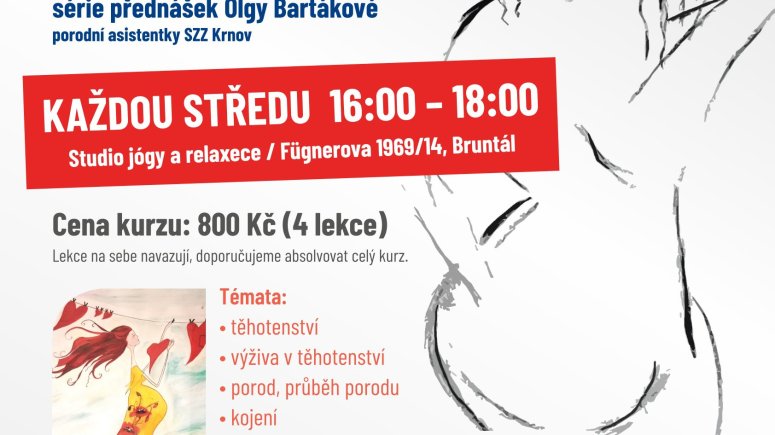 Kurz se skládá ze čtyř na sebe navazujících lekcí, konat se bude ve Studiu jógy a relaxace. Součástí jsou nejen zajímavé přednášky, ale také cvičení. „Povídat si budeme o těhotenství, správné výživě v těhotenství. Velkou část přednášek věnujeme porodu, vysvětlíme si jednotlivé typy porodů, různé způsoby porodních poloh, ale také možnosti uvolnění a zmírnění bolesti. Nezapomeneme ani na správnou relaxaci, proto jsem do kurzu zařadila také cvičení, a to jak relaxační, tak zaměřené na prevenci bolesti zad. Rodiče se samozřejmě také dozví potřebné informace o péči o miminko, včetně kojení a role laktační poradkyně,“ shrnula v krátkosti náplň kurzu porodní asistentka Olga Bartáková z krnovské porodnice.