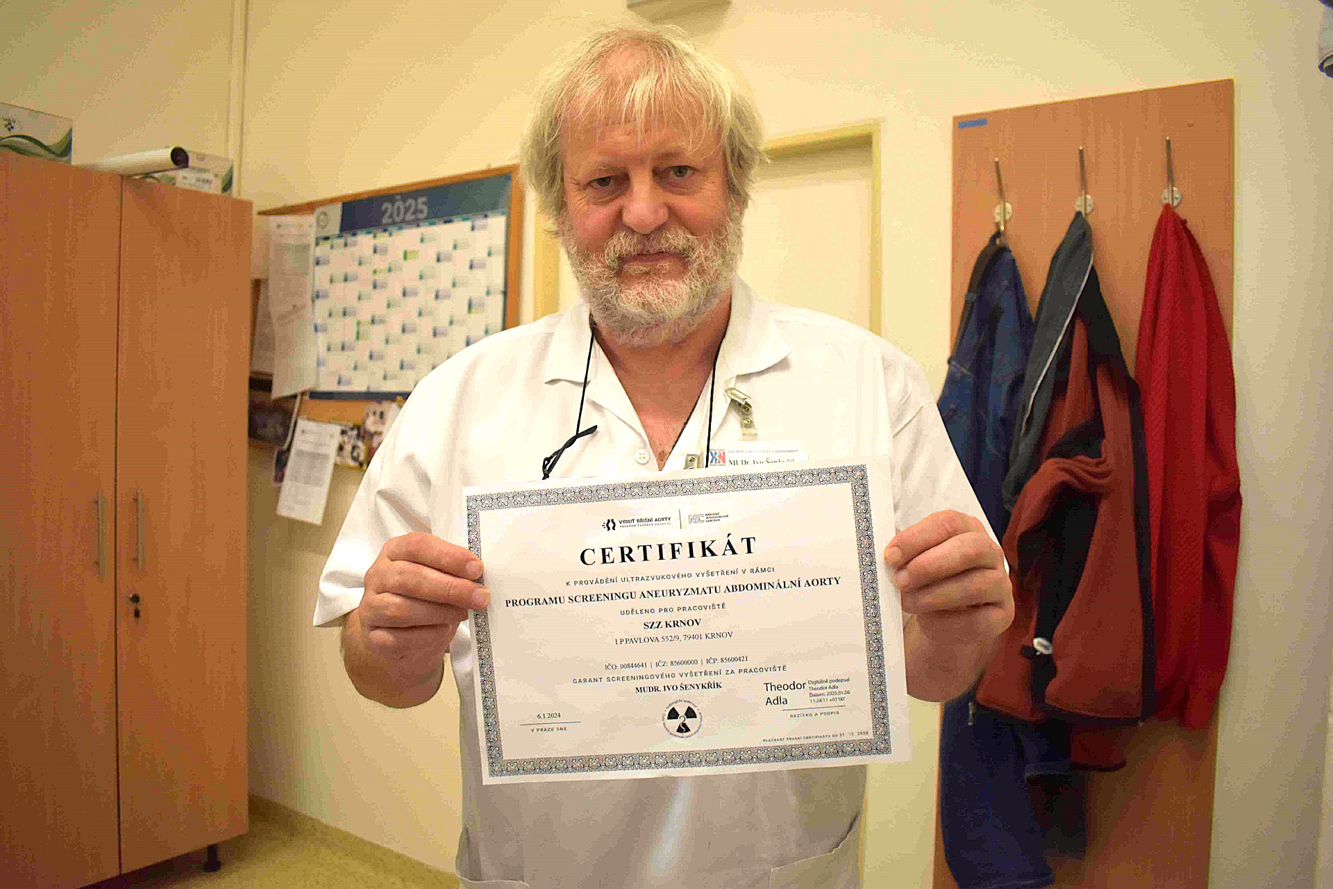 Radiodiagnostické oddělení (RDG) krnovské nemocnice je certifikované pracoviště k provádění screeningu aneuryzmatu abdominální aorty. Primář RDG MUDr. Ivo Šenkyřík představuje certifikát. Příjem žádanek probíhá telefonicky na čísle 554 690 325.