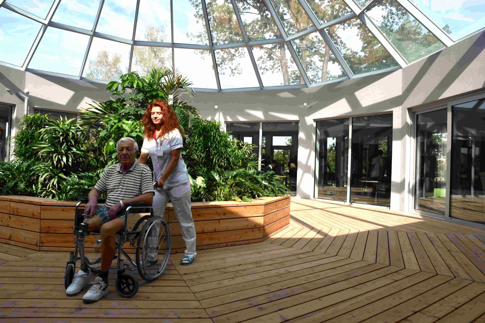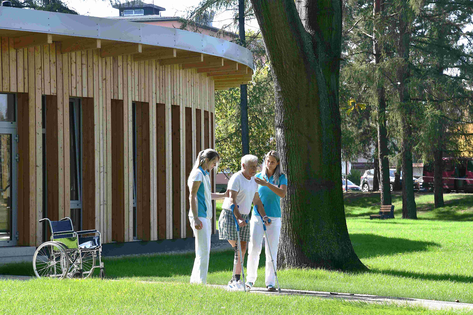 Ortopedický pacient pan Jiří v krnovské nemocnici rehabilituje po operaci. „Byl jsem zvědavý, co se staví v parku a jak to bude fungovat. Sestřičky mi vysvětlily, že nemocný člověk po úrazu nebo v pokročilém věku může bydlet doma, a přitom chodit do nemocnice na procházky a cvičit. Budeme tady mít odborné vedení a vybavení jako v lázních, a také příjemná místa v parku i v respiriu na oddech a posezení třeba s rodinou,“ řekl pan Jiří.
