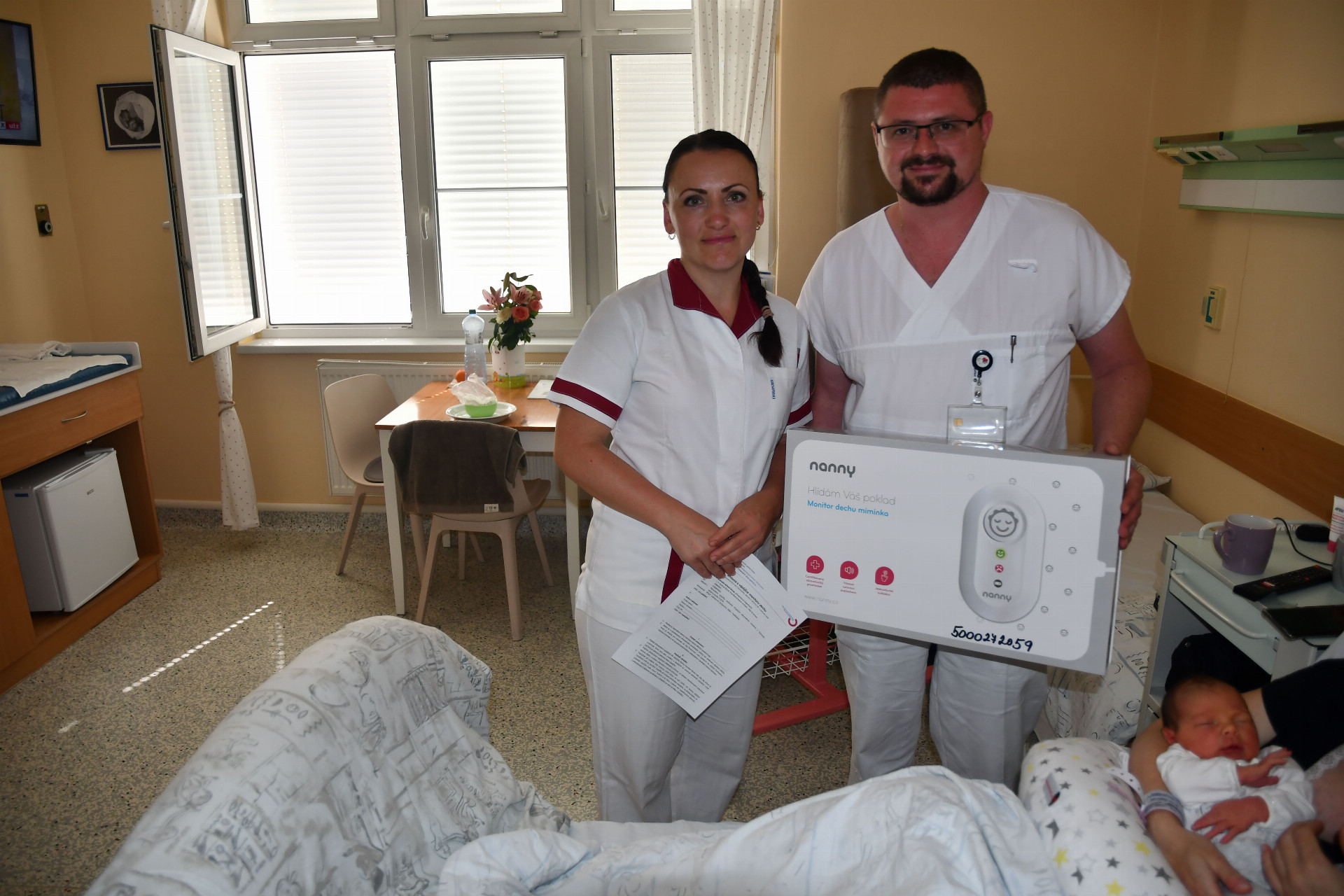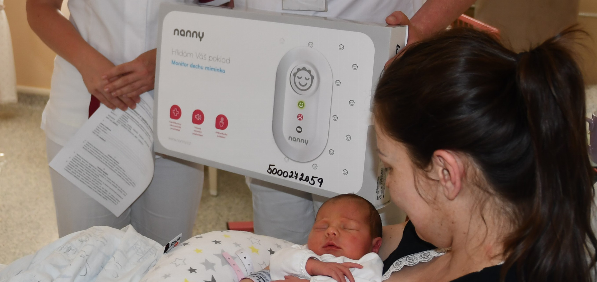 Monitor dechu je certifikovaný zdravotnický prostředek pro sledování dechu dítěte. Mamince ho v porodnici představil zástupce dětského oddělení Mgr. Josef Lhoťan, MBAce.
